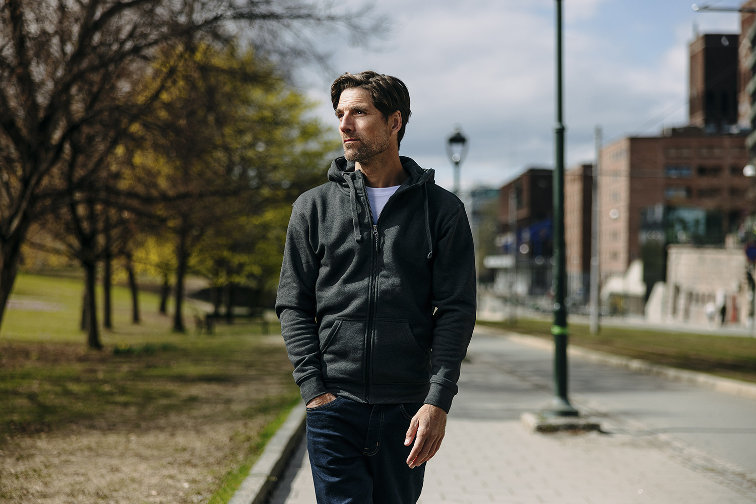 Bestselgende klassisk unisex hettejakke. Dobbel jerseystrikket, lycra i alle ribber og flosset innside. Snøring og fôring i hette. Stikklommer med mediaport i front. 300 – 320 g/m². 65% bomull / 35% polyester.