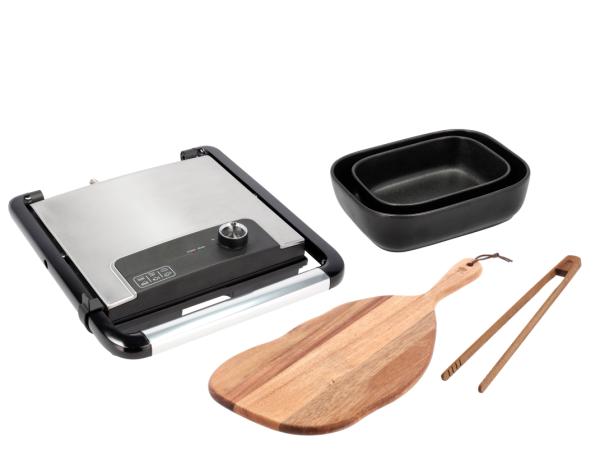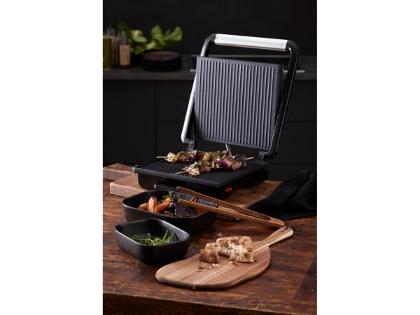 Samle familien rundt bordet til en grillopplevelse innendørs. Her får du en HOLM kontaktgrill med et grillareal på 29 x 26 cm, pinsett og et flott fat med håndtak 48 x 20 x 1,5 cm i akasie, perfekt til servering eller som skjærebrett ved tilberedning av måltidet, samt to ildfaste former i svart steintøy 19 x 15 x 5,6 cm og 24 x 18,5 x 6,5 cm.