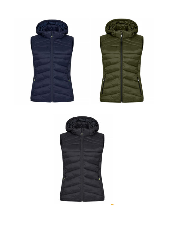En varm, men likevel lett vest med dunlignende vattering. Laget av 100 % resirkulert polyamid. Tre utvendige lommer med glidelås, og to innerlommer. Elastisk teip i nederkant og ved ermåpningene. Damevesten kommer med avtagbar hette. Leveres med farget stropp (til oppheng), øretelefonløsning og glidelåstrekkere.