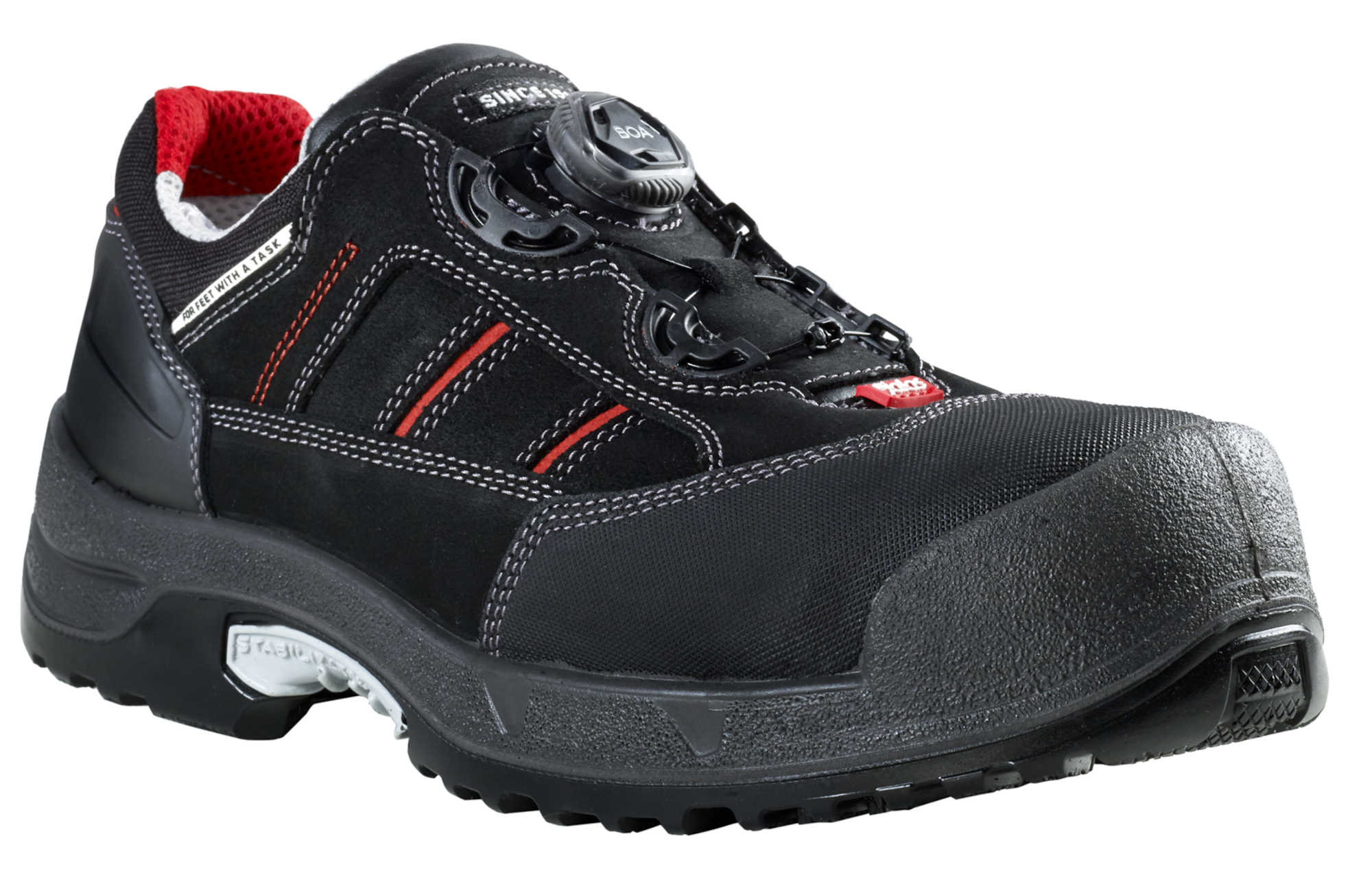 Komfort og beskyttelse i en myk vernesko med unikt BOA® Fit System og overdel i PU-behandlet/spaltet lær. Utmerket ergonomi og antistatiske egenskaper for bedre passform, og innersåle i merinoull holder føttene tørre. RPU-yttersålen er oljebestandig for utmerket grep. Skoen har også JALAS® aluminiumståhette, plasmabehandlet spikertrampbeskyttelse og doble støtdempingssoner i PORON® XRD®. Beskyttelsesklasse (S3).